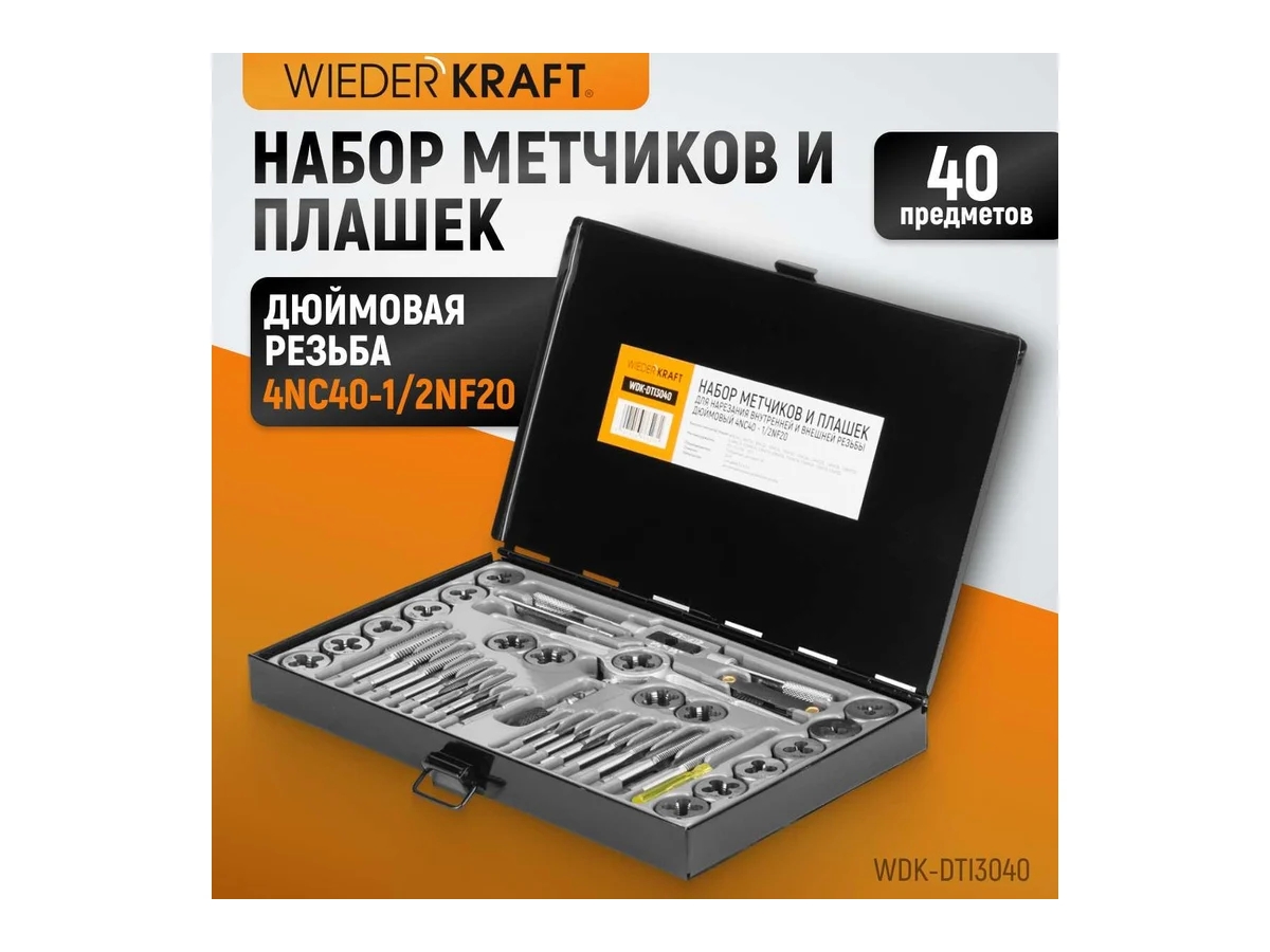 Набор метчиков и плашек 4NC40-1/2NF20 WIEDERKRAFT 40 предметов, дюймовая резьба WDK-DTI3040 представляет собой комплект резьбонарезного инструмента.