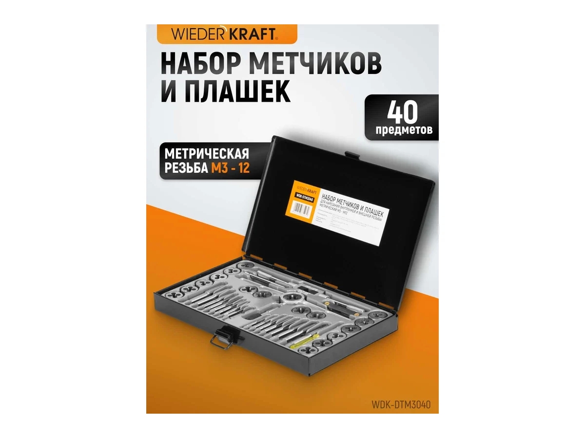 Набор метчиков и плашек М3-12 WIEDERKRAFT 40 предметов, метрическая резьба WDK-DTM3040представляет собой комплект резьбонарезного инструмента.