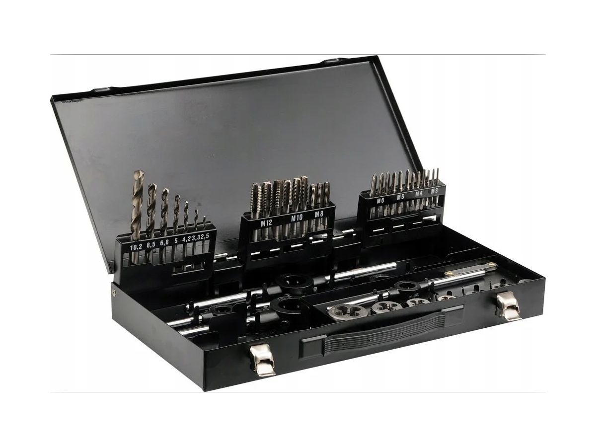 В набор входят различные виды метчиков и плашек, что позволяет выполнять широкий спектр работ по нарезанию резьбы.