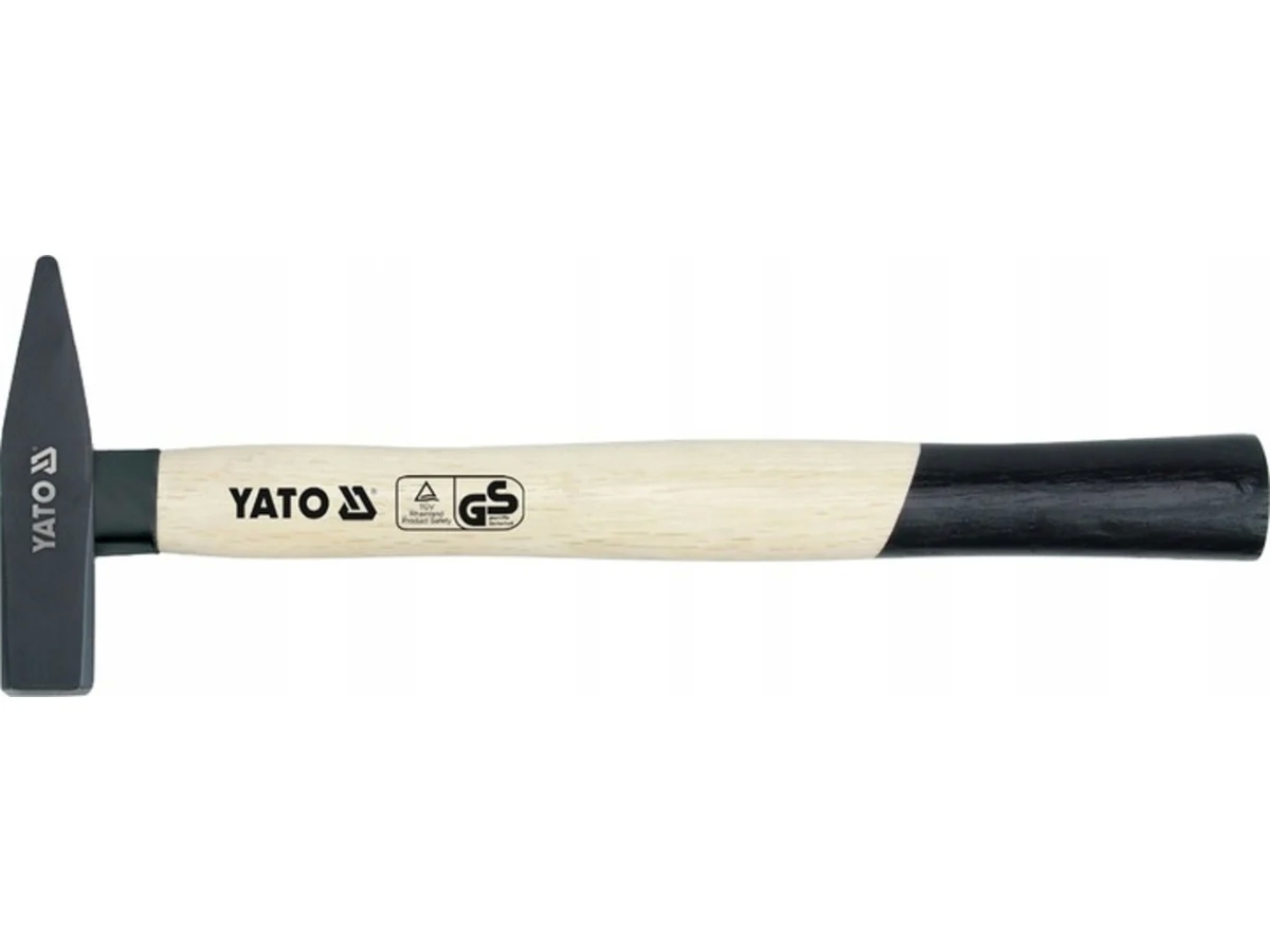 Головка молотка холоднокованая, черненая поверхность, закреплена на деревянной, лакированной рукоятке, соединение закреплено металлическим кольцевым клином, рукоятка под головкой закреплена металлической втулкой и дополнительным резиновым защитным кольцом. Изготовлено в соответствии с GS и DIN1041.