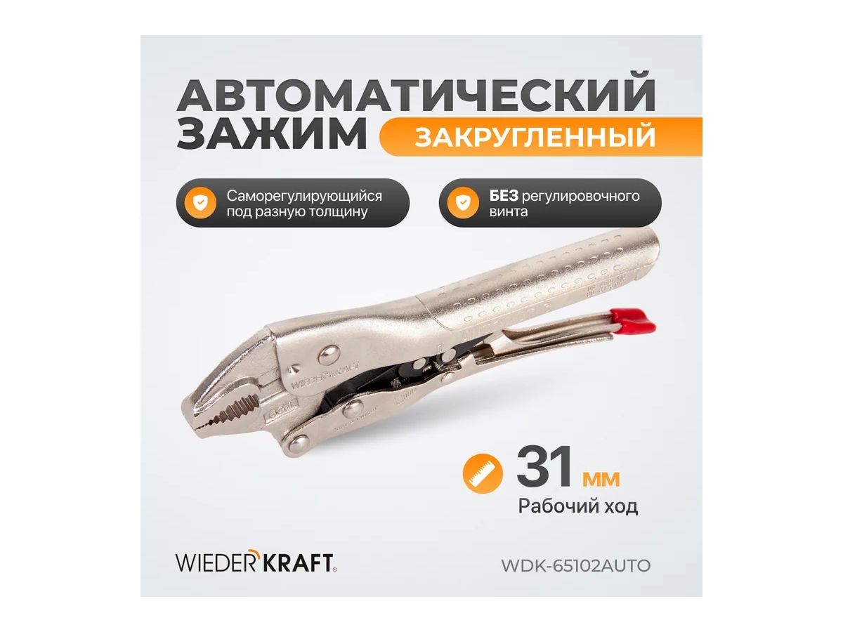 Автоматический зажим WDK-65102AUTO закругленный с фиксатором предназначен для надежного удержания деталей при сварке, сборке и других слесарных работах. Благодаря автоматической подстройке под толщину заготовки инструмент значительно ускоряет рабочий процесс и повышает удобство эксплуатации. Усилие зажима при необходимости регулируется вручную для точной подгонки под конкретную задачу.
