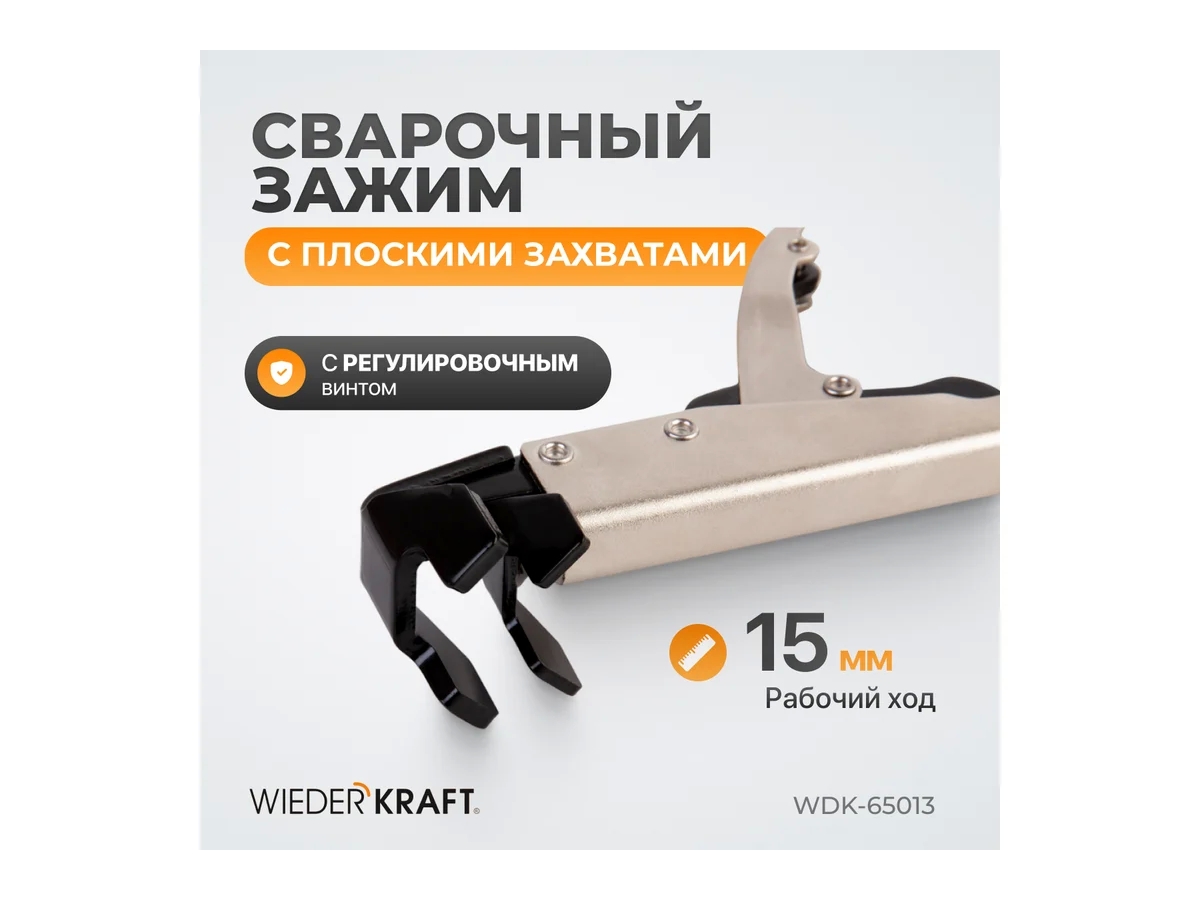 Угловой зажим WIEDERKRAFT WDK-65013 с плоскими захватами предназначен для точной фиксации деталей под углом 90° при сварочных и кузовных работах. Захват подходит специалистам по кузовным работам и листовой стали. Прочная конструкция из хромованадиевого сплава устойчива к износу и нагреву, а фиксатор позволяет работать без удержания инструмента руками.