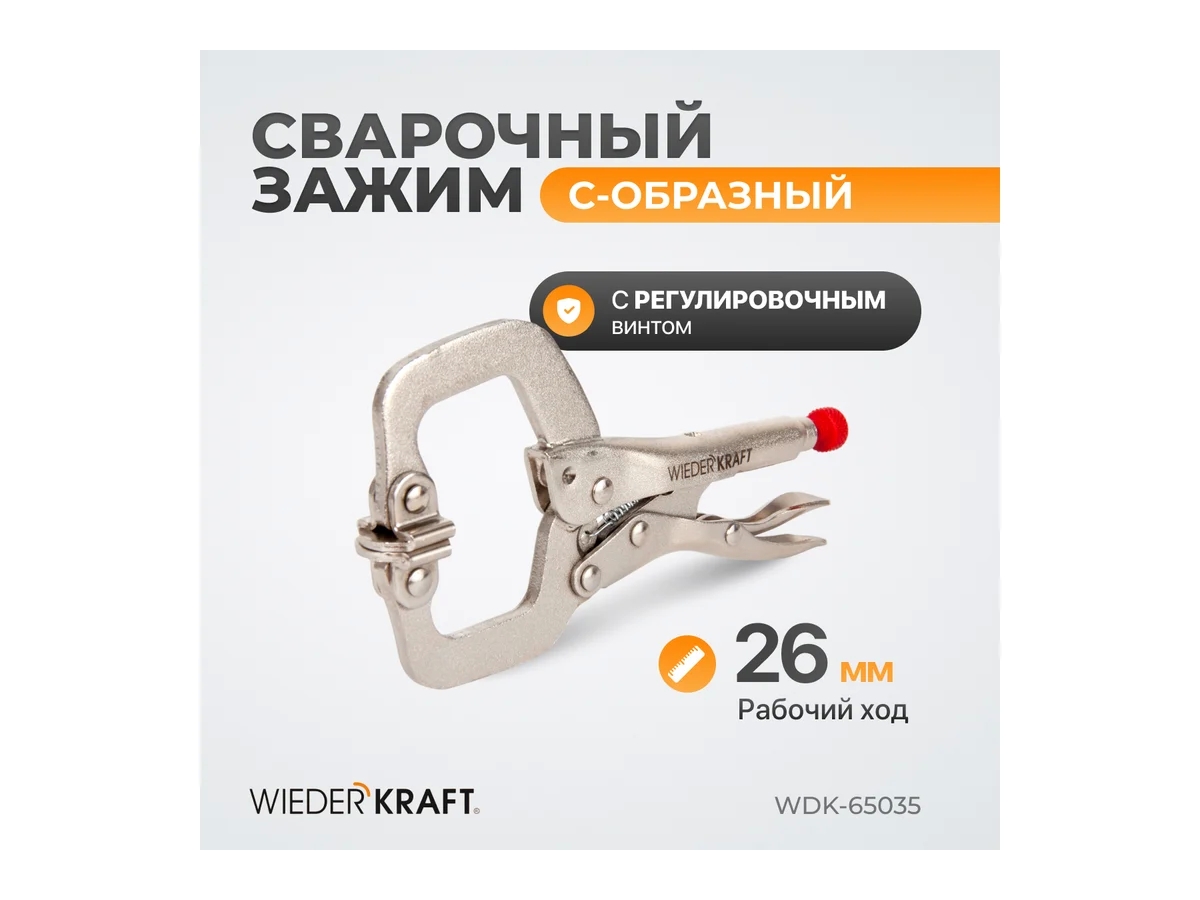 С-образный зажим WIEDERKRAFT WDK-65035 предназначен для надежной фиксации деталей при сварке, сборке и других ремонтных работах. Изготовлен из легированной стали с хромированным покрытием, обеспечивающим защиту от коррозии и механических повреждений. Конструкция зажима проста, удобна и рассчитана на длительную эксплуатацию. Винт оснащен технологическим отверстием для более надежной фиксации и удобства регулировки.