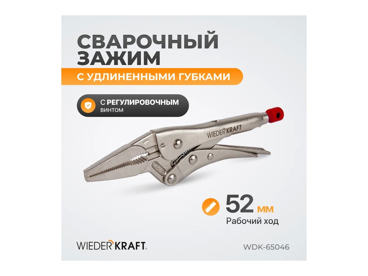 Удлиненный зажим WIEDERKRAFT WDK-65046 предназначен для надежной фиксации деталей при сварке, сборке и других ремонтных работах. Изготовлен из легированной стали с хромированным покрытием, обеспечивающим защиту от коррозии и механических повреждений. Конструкция зажима проста, удобна и рассчитана на длительную эксплуатацию. Винт оснащен технологическим отверстием для более надежной фиксации и удобства регулировки.