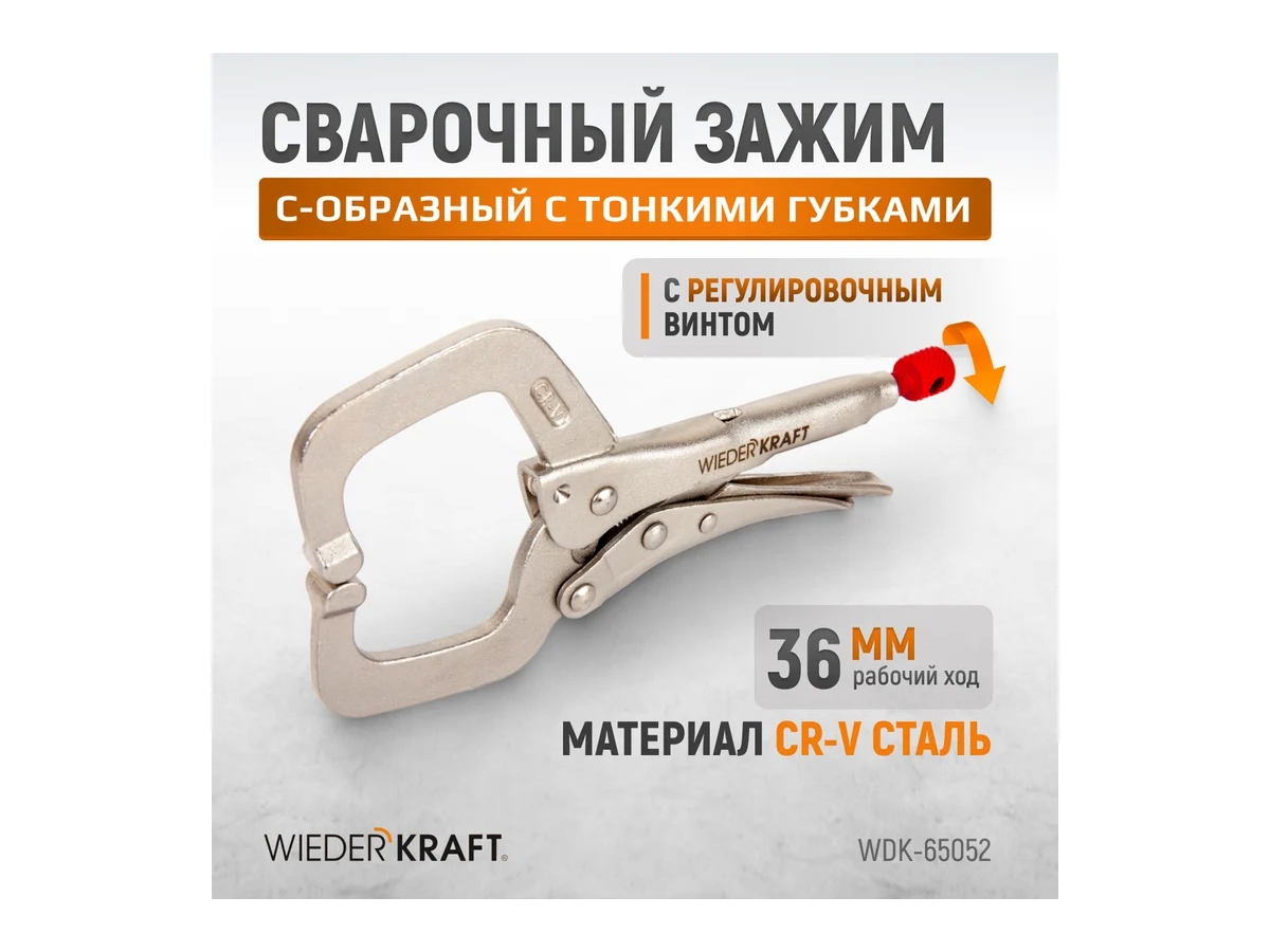 С-образный зажим WIEDERKRAFT WDK-65052 предназначен для надежной фиксации деталей при сварке, сборке и других ремонтных работах. Изготовлен из легированной стали с хромированным покрытием, обеспечивающим защиту от коррозии и механических повреждений. Конструкция зажима проста, удобна и рассчитана на длительную эксплуатацию. Винт оснащен технологическим отверстием для более надежной фиксации и удобства регулировки.