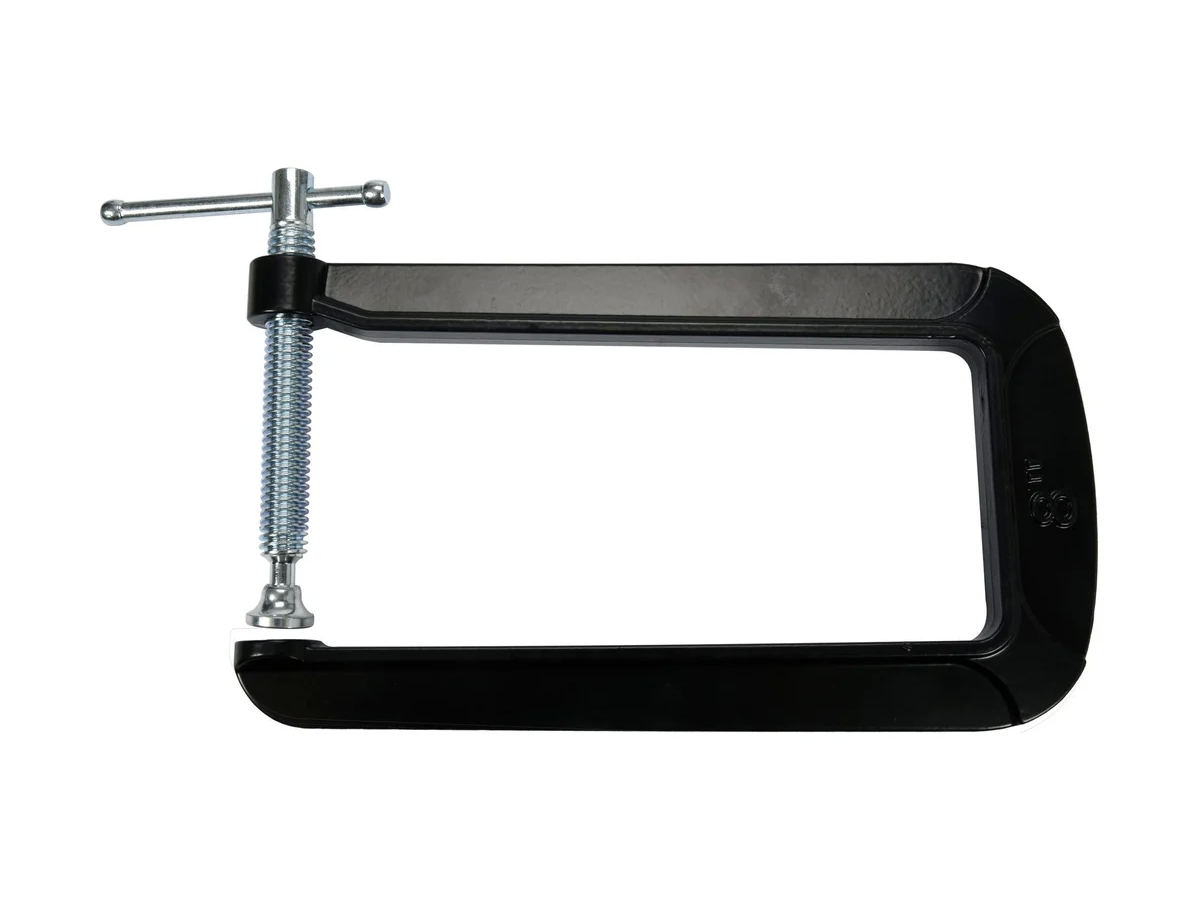 Практичная и популярная С-образные струбцина в глубокой конструкции позволяет зажимать соединяемые детали на относительно большом расстоянии от края материала. Корпус хомутов изготовлен из ковкого чугуна, защищен от ржавчины порошковым покрытием. Винт из оцинкованной стали с подвижной прижимной пластиной, установленный на стыке. Глубина ок. 203 мм, высота ок. 76 мм, усилие прессования ок. 3 кН. Предназначена для плотницких и монтажных работ