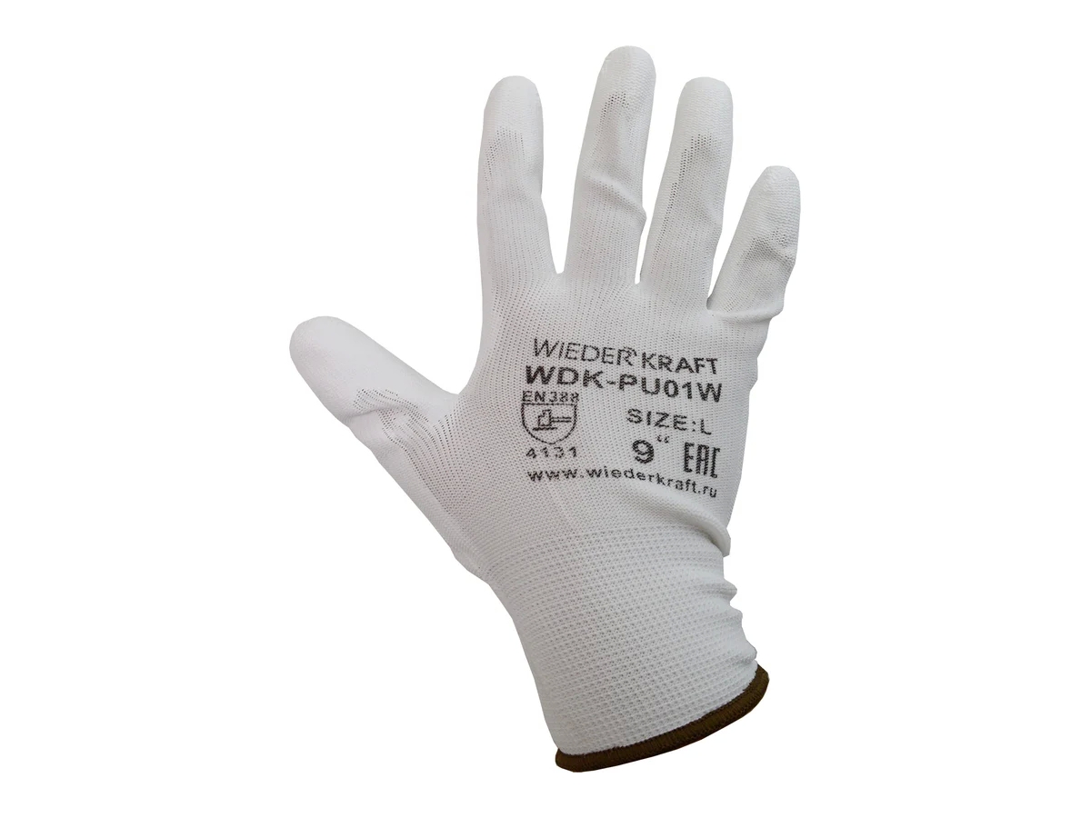 Белые легкие бесшовные защитные перчатки эргономичной формы из нейлона WIEDERKRAFT WDK-PU01W / XXL используются при работе с инструментом, мелкими деталями и крепежом. Сохраняют чувствительность пальцев. Надежно защищают от контакта с масляными и другими загрязнениями.