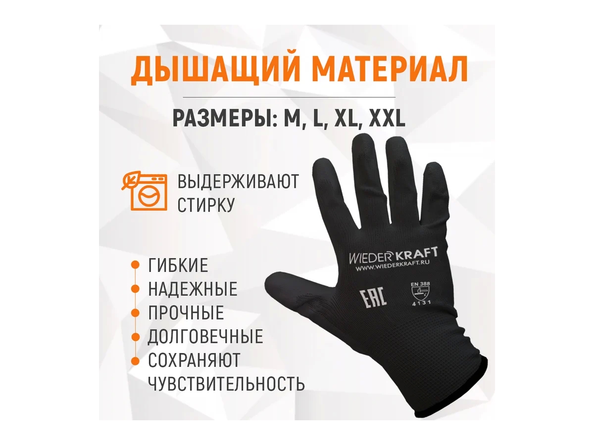 Легкие бесшовные защитные перчатки эргономичной формы из нейлона WIEDERKRAFT WDK-PU01B / L используются при работе с инструментом, мелкими деталями и крепежом. Сохраняют чувствительность пальцев. Надежно защищают от контакта с масляными и другими загрязнениями.