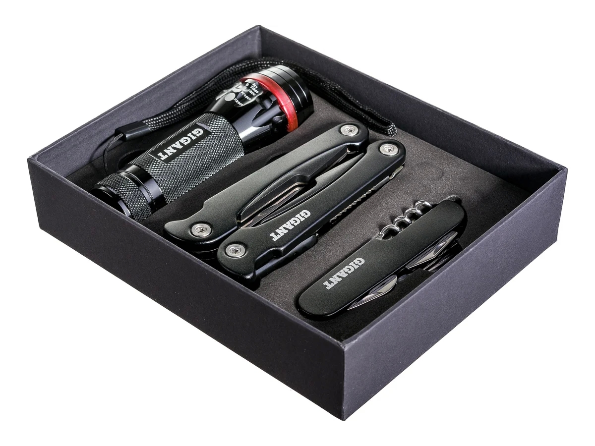 - Функциидлинногубцы, плоскогубцы, кабелерез, открывалка для бутылок, плоская отвертка, крестовая отвертка, напильник, кожаный резак, консервный нож, пила, нож, ножницы, зубчатый нож, очиститель для ногтей, пилка для ногтей, зенковка, развертка, штопор