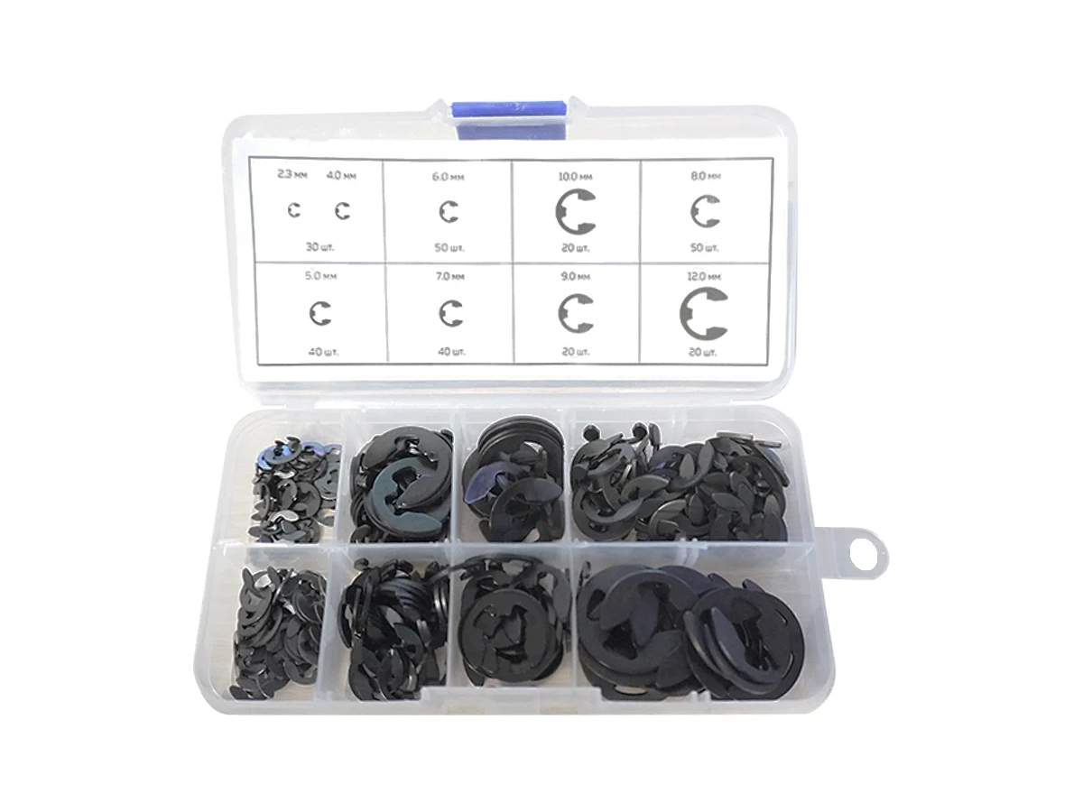 Набор стопорных колец (300 шт.) включает 9 самых популярных размеров от 2,3 до 12 мм, удовлетворяя большинство потребностей в ремонте и сборке. Удобный пластиковый кейс с перегородками обеспечивает надежное хранение и быстрый поиск нужного кольца. Незаменимый набор для мастерской, гаража или дома.