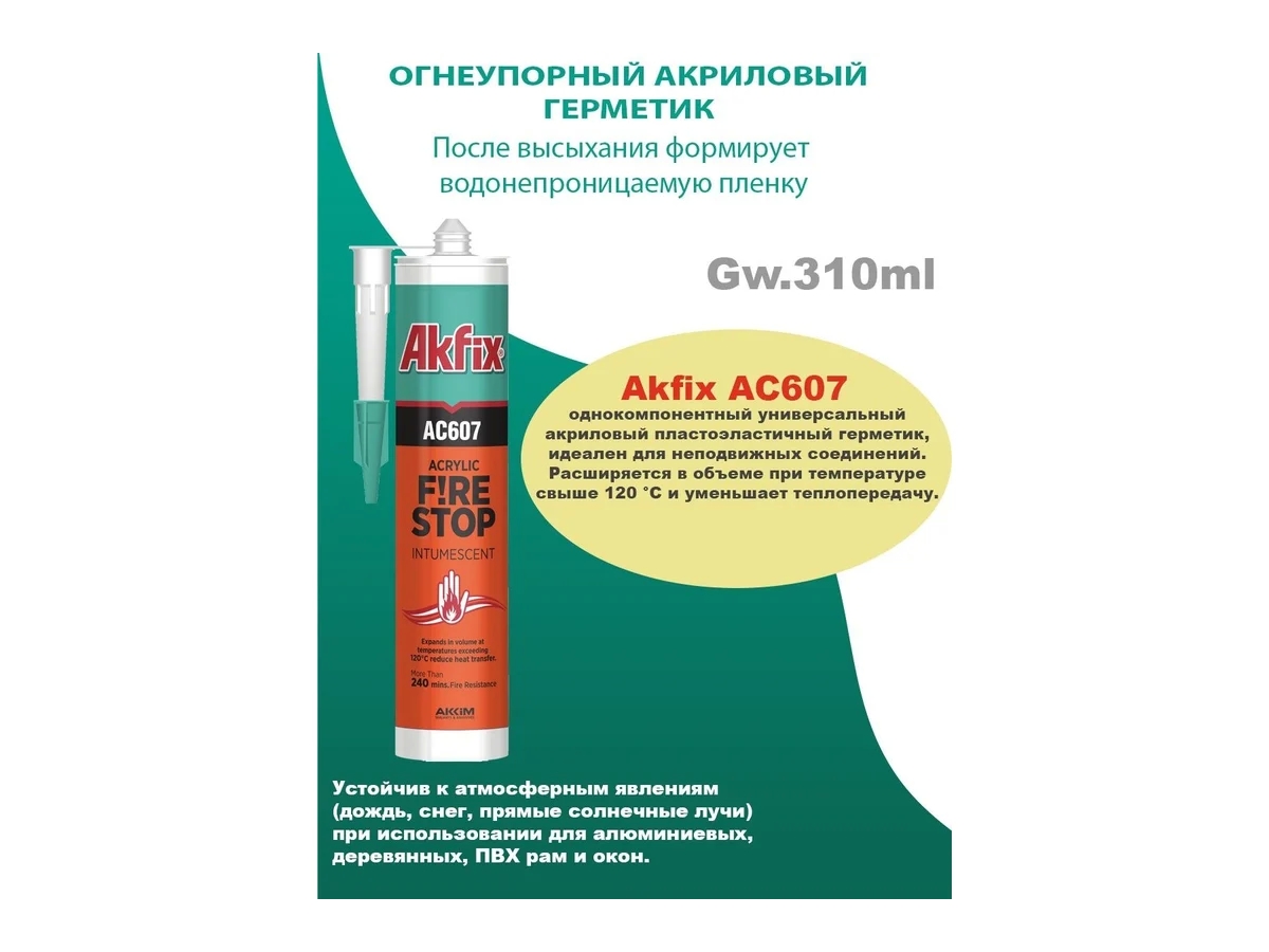 Огнестойкий акриловый герметик Akfix AC607 белый, 310 мл AA701 пластоэластичный идеален для неподвижных соединений. Расширяется в объеме при температуре свыше 120 °C и уменьшает теплопередачу. При таком уровне температуры происходит испарение жидкости, что позволяет выиграть время при воспламенении за счет эффекта охлаждения.