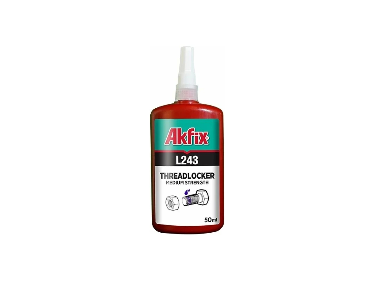 Анаэробный фиксатор резьбы средней прочности Akfix L243 50 мл, L243_01 предназначен для надежной фиксации метрических и стандартных гаек и болтов (монтажные болты, корпусные винты). Состав затвердевает при отсутствии воздуха между плотно прилегающими металлическими поверхностями. Продукт предотвращает коррозию собранных деталей, ослабление вибрации и утечки через резьбу.