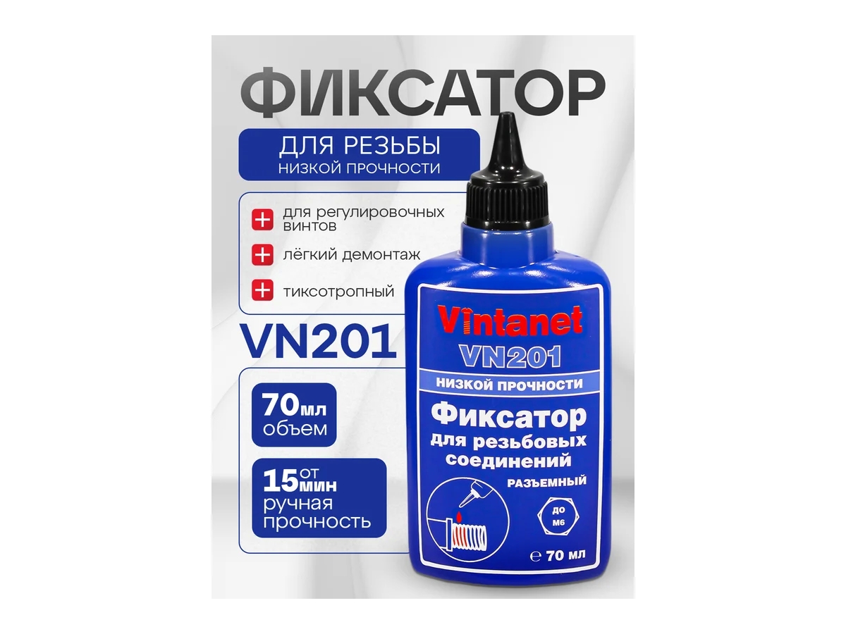 Фиксатор для резьбовых соединений, низкопрочный, анаэробный VINTANET VN201, 70 мл VN20170ML - фиксатор низкой прочности, средней вязкости для резьбовых соединений с зазорами до 0,15мм, анаэробный, отверждающийся при нарушении контакта с воздухом с образованием полимерного слоя. Для нанесения на любые металлы, включая пассивные основания, такие как нержавеющая сталь, алюминий и поверхности с гальваническим покрытием. Продукт обладает коротким временем фиксации на стали, латуни и нержавеющей стали - 10, 15 и 20 мин соответственно. Демонстрирует высокую устойчивость к незначительному загрязнению промышленными маслами (например, моторными, антикоррозионными маслами), а также смазочно-охлаждающими жидкостями.