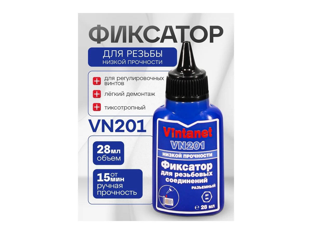 Фиксатор для резьбовых соединений, низкопрочный, анаэробный VINTANET VN201, 28 мл VN20128ML - фиксатор низкой прочности, средней вязкости для резьбовых соединений с зазорами до 0,15мм, анаэробный, отверждающийся при нарушении контакта с воздухом с образованием полимерного слоя. Для нанесения на любые металлы, включая пассивные основания, такие как нержавеющая сталь, алюминий и поверхности с гальваническим покрытием. Продукт обладает коротким временем фиксации на стали, латуни и нержавеющей стали - 10, 15 и 20 мин соответственно. Демонстрирует высокую устойчивость к незначительному загрязнению промышленными маслами (например, моторными, антикоррозионными маслами), а также смазочно-охлаждающими жидкостями.