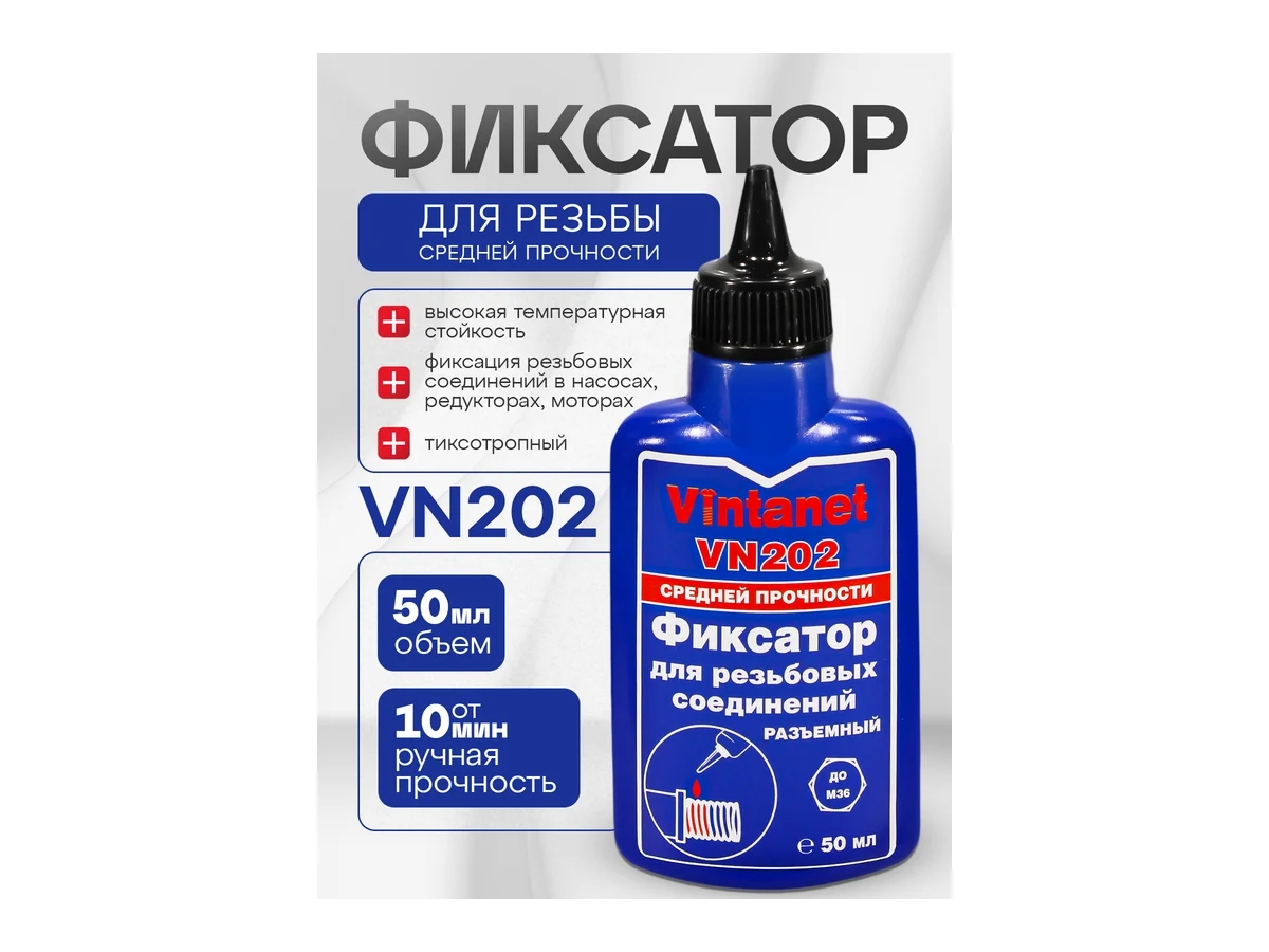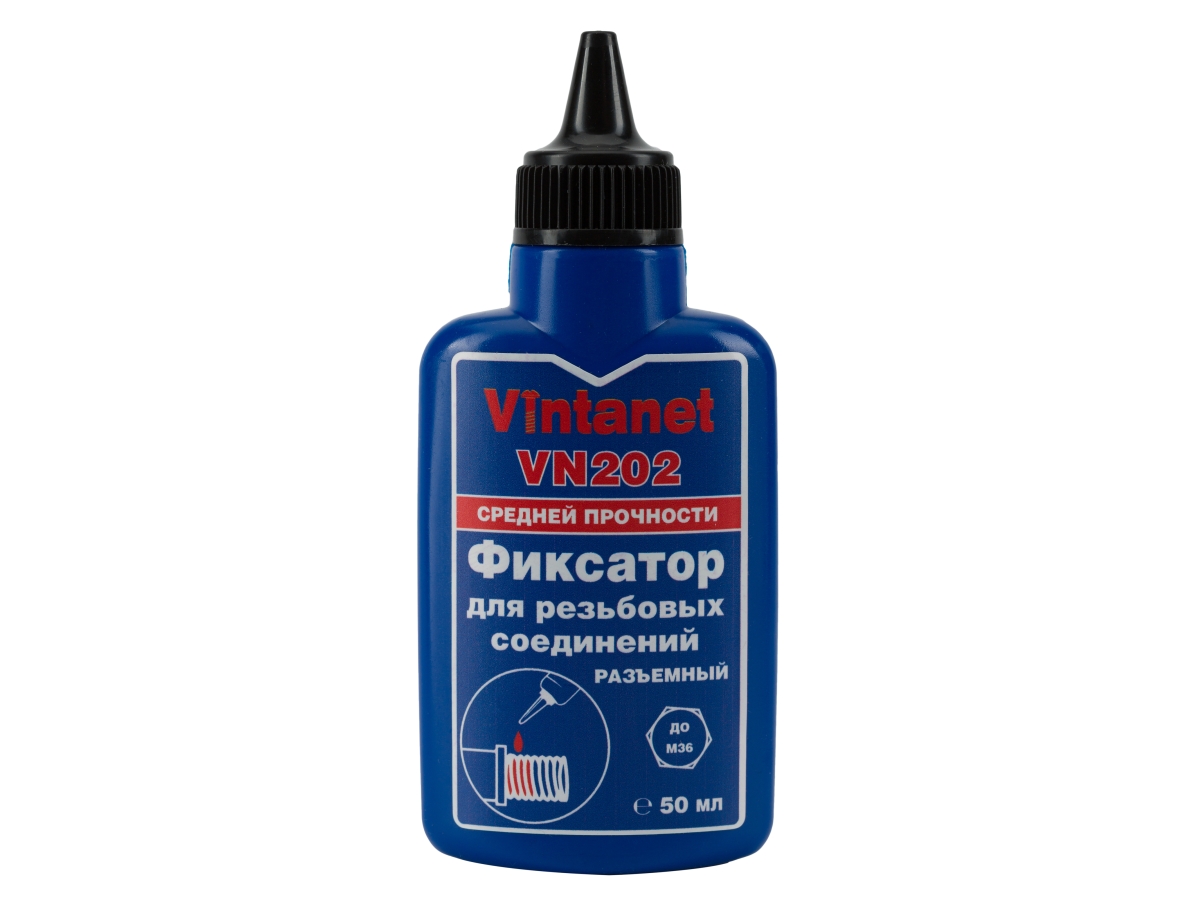Фиксатор для резьбовых соединений, средней прочности, анаэробный VINTANET VN202 50 мл VN20250ML - фиксатор средней прочности, средней вязкости для резьбовых соединений с зазорами до 0,5мм, анаэробный, отверждающийся при нарушении контакта с воздухом с образованием полимерного слоя. Для нанесения на любые металлы, включая пассивные основания, такие как нержавеющая сталь, алюминий и поверхности с гальваническим покрытием. Продукт обладает коротким временем фиксации на стали, латуни и нержавеющей стали – 5, 10 и 15 мин соответственно. Демонстрирует высокую устойчивость к незначительному загрязнению промышленными маслами (например, моторными, антикоррозионными маслами), а также смазочно-охлаждающими жидкостями.
