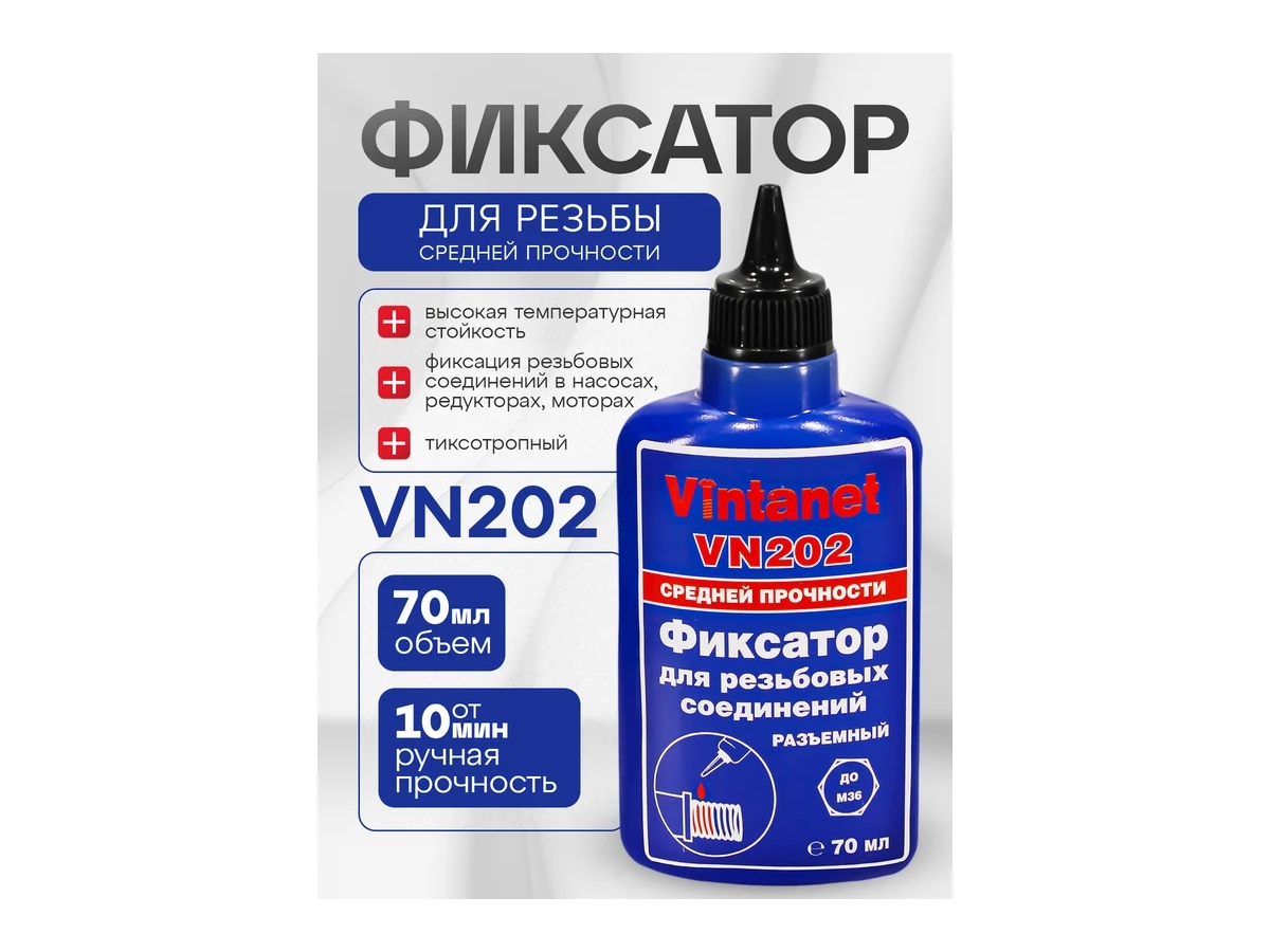 Фиксатор для резьбовых соединений, средней прочности, анаэробный VINTANET VN202 70 мл VN20270ML - фиксатор средней прочности, средней вязкости для резьбовых соединений с зазорами до 0,5мм, анаэробный, отверждающийся при нарушении контакта с воздухом с образованием полимерного слоя. Для нанесения на любые металлы, включая пассивные основания, такие как нержавеющая сталь, алюминий и поверхности с гальваническим покрытием. Продукт обладает коротким временем фиксации на стали, латуни и нержавеющей стали – 5, 10 и 15 мин соответственно. Демонстрирует высокую устойчивость к незначительному загрязнению промышленными маслами (например, моторными, антикоррозионными маслами), а также смазочно-охлаждающими жидкостями.