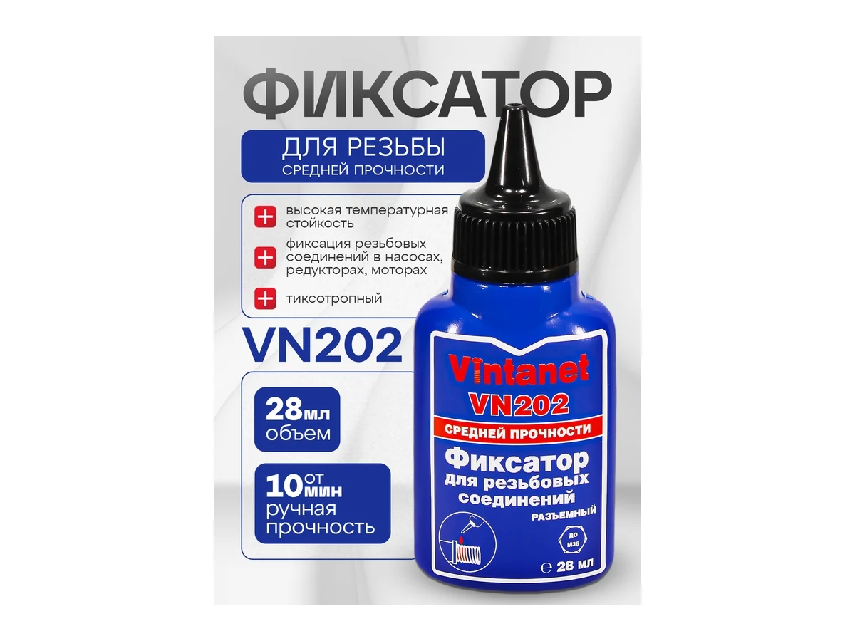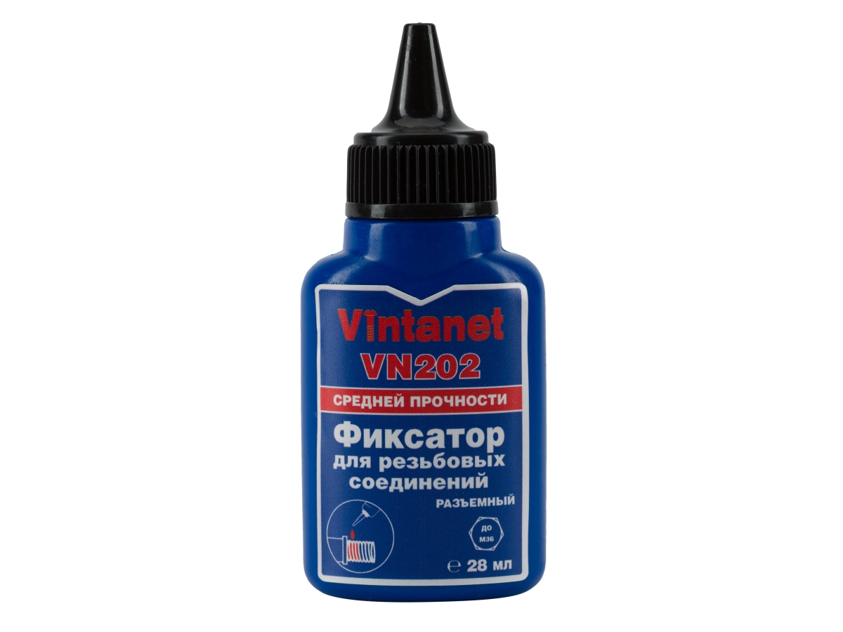 Фиксатор для резьбовых соединений, средней прочности, анаэробный VINTANET VN202 28 мл VN20228ML - фиксатор средней прочности, средней вязкости для резьбовых соединений с зазорами до 0,5 мм, анаэробный, отверждающийся при нарушении контакта с воздухом с образованием полимерного слоя. Для нанесения на любые металлы, включая пассивные основания, такие как нержавеющая сталь, алюминий и поверхности с гальваническим покрытием. Продукт обладает коротким временем фиксации на стали, латуни и нержавеющей стали – 5, 10 и 15 мин соответственно. Демонстрирует высокую устойчивость к незначительному загрязнению промышленными маслами (например, моторными, антикоррозионными маслами), а также смазочно-охлаждающими жидкостями.