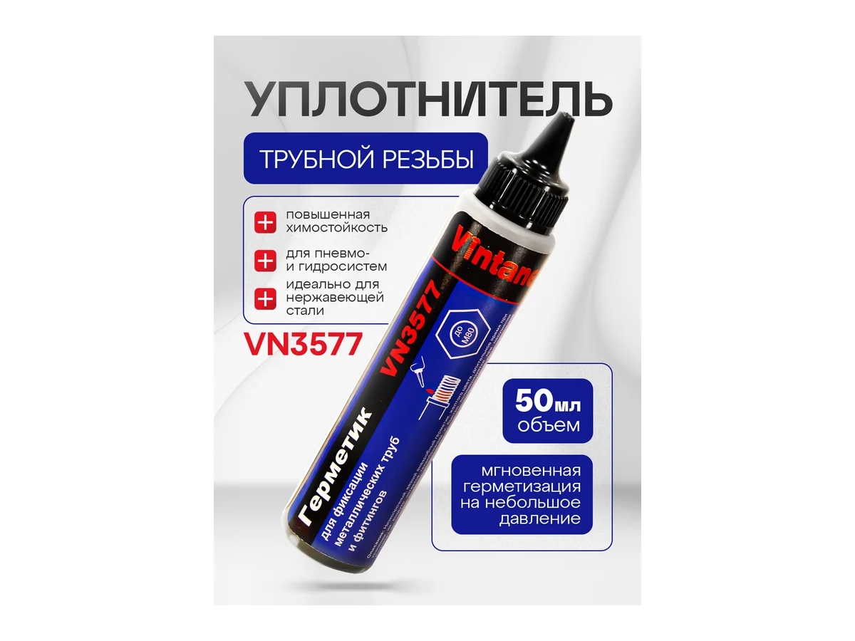 Герметик для фиксации металлических труб и фитингов гелеобразный VINTANET VN3577 VN357750ML - низкопрочный, вязкий анаэробный герметик 50 мл, желтого цвета, который длительное время при хранении на воздухе остается гелеобразным и быстро отверждается (полимеризуются) при нарушении контакта с кислородом воздуха (например, в узком зазоре между металлическими поверхностями) с образованием прочного полимерного слоя. Применяется для фиксации и герметизации металлических резьбовых (до М80) трубных соединений. Продукт полимеризуется в условиях отсутствия воздуха в небольших зазорах (до 0,5мм) между металлическими поверхностями и обеспечивает фиксацию и герметизацию соединений в условиях высоких нагрузок и вибраций, например фланцев, для фиксации узлов и агрегатов, подверженных значительным динамическим осевым и радиальным нагрузкам. Герметик возможно использовать для замены применяющихся в настоящее время паронитовых, картонных и жидких прокладок на силиконовой основе. Скорость полимеризации зависит от материала сопрягаемых детелей, от величины зазора и температуры воздуха в рабочем помещении. В случае чрезмерно больших зазоров или невозможности повышения температыры воздуха скорость полимеризации можно увеличить применением Активатора. Рекомендуется применять там, где необходима легкая разборка с помощью ручного инструмента. В случае затруднения при демонтаже соединений, нагреть локально узел до +150-200°C и разобрать в горячем состоянии.