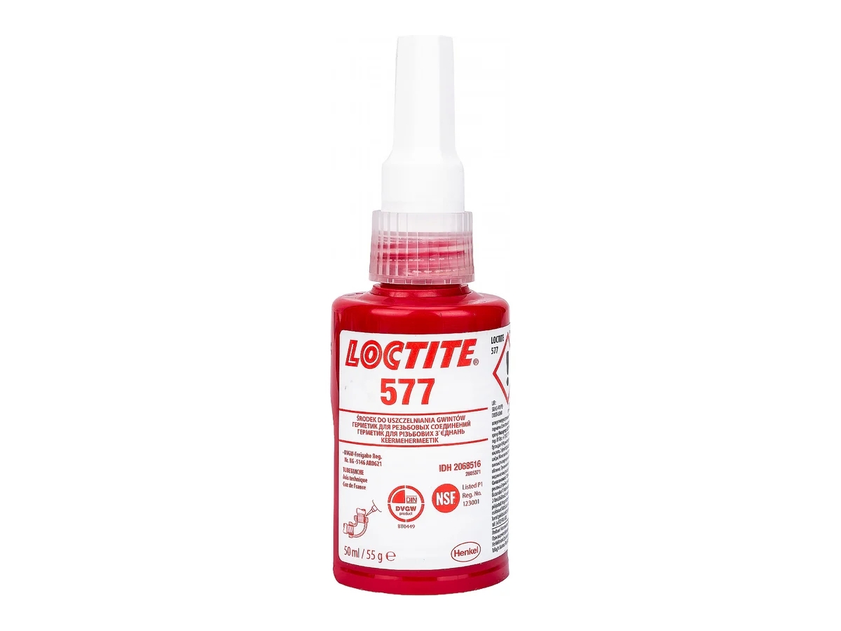 Резьбовой гелеобразный герметик Loctite 577 для неактивных металлов 50 мл 2068516 представляет собой универсальный однокомпонентный состав для обработки всех типов резьбы до М80 (R 3”).
