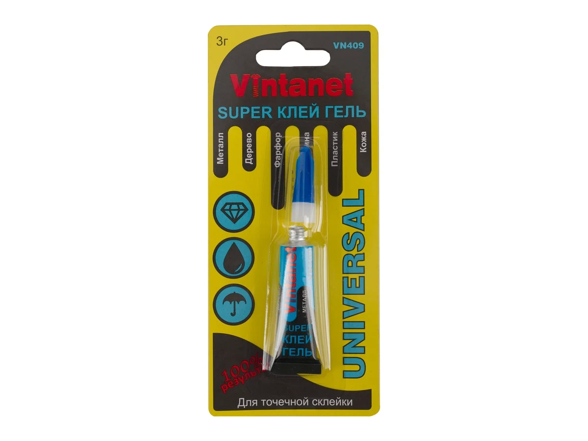 Клей моментальный цианоакрилатный гель VINTANET VN409 предназначен для склеивания различных видов пластмасс, резины, металлов, дерева, фарфора, керамики, кожи, пробки, тканей, картона и бумаги. Не пригоден для склеивания полипропилена, полиэтилена, политетрафторэтилена (тефлона), стекла, глазированных поверхностей и силиконовой резины. Также не пригоден для склеивания очень мягкой кожи.