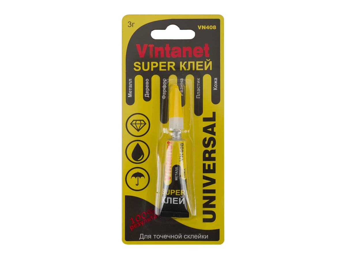 Клей моментальный цианоакрилатный общего назначения VINTANET VN408 предназначен для склеивание различных видов пластмасс, резины, металлов, дерева, фарфора, керамики, кожи, пробки, тканей, картона и бумаги. Не пригоден для склеивания полипропилена, полиэтилена, политетрафторэтилена (тефлона), стекла, глазированных поверхностей и силиконовой резины. Также не пригоден для склеивания очень мягкой кожи.