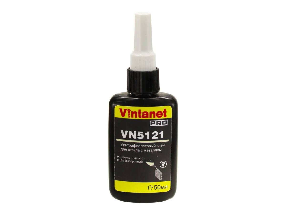 Высокопрочный продукт светло-желтого цвета, 10 секунд для фиксации положения и 20 секунд для прочности под УФ-лампой или солнечным светом. Первичная прочность наступает через 1 час, полная прочность через 12 часов. Применение: используется для приклеивания стекла к металлу (пример: стеклянная мебель с металлическими кронштейнами).