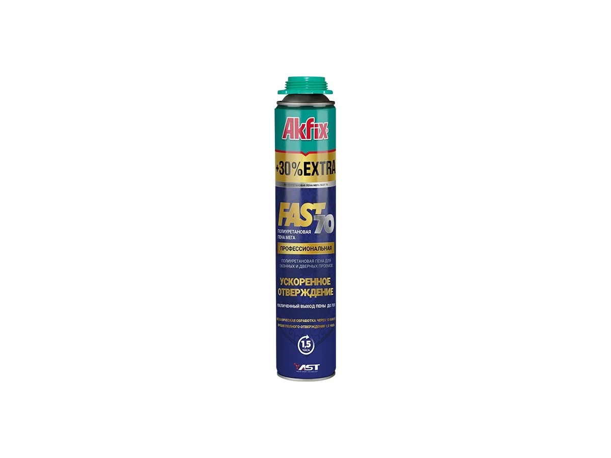 Профессиональная монтажная пена с ускоренным отверждением Akfix 70 л, 1000 г FAST70 предназначена для оконных и дверных проемов. Отличается устойчивостью к плесени и влаге. Пена эффективно герметизирует зазоры благодаря отличной заполняющей способности. Объем выхода достигает 70 литров, пену можно обрезать уже через 10 минут.